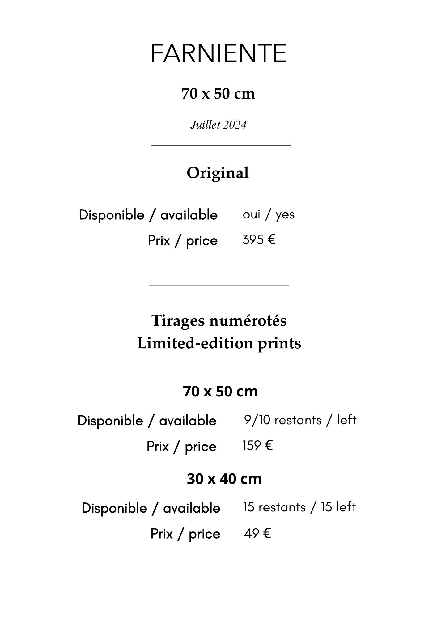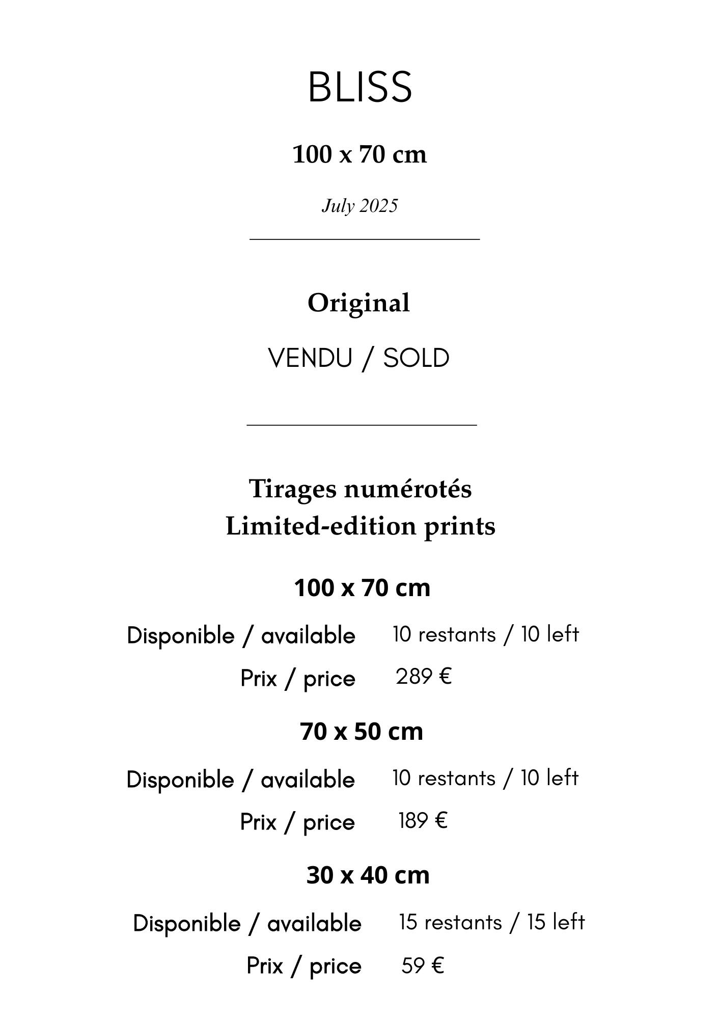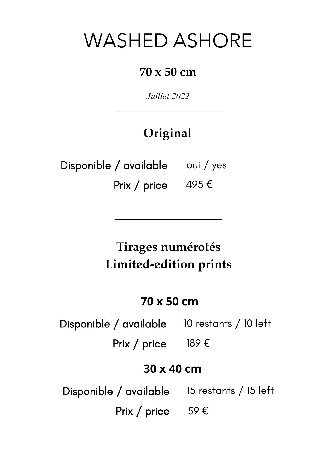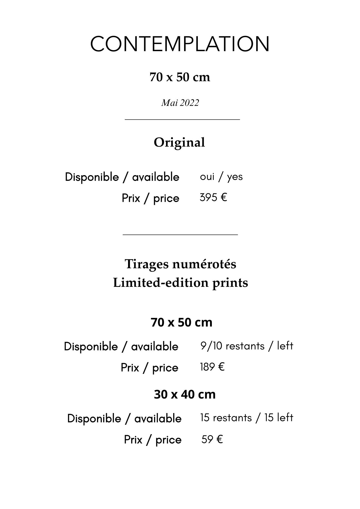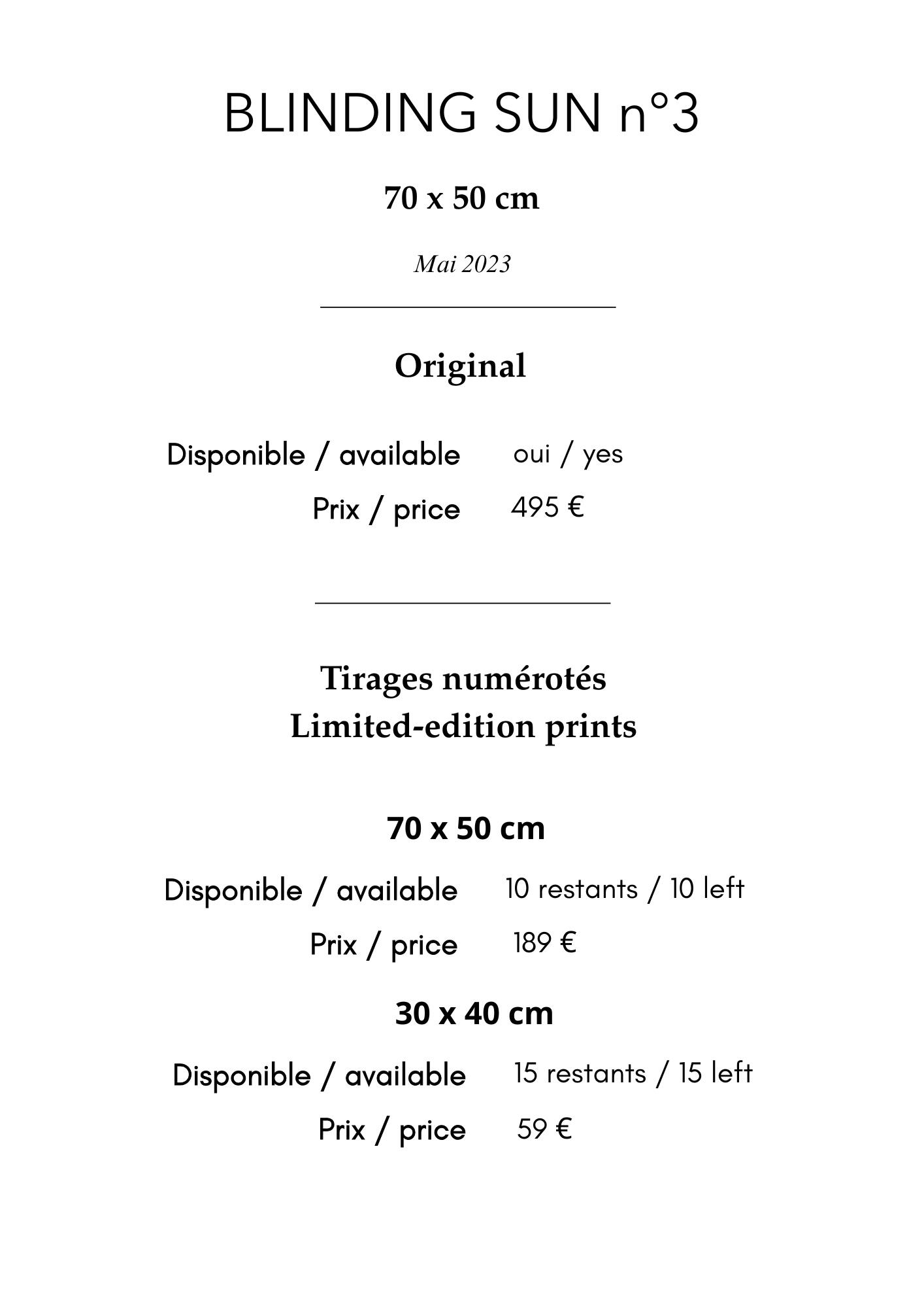 J’ai veillé à ce que les impressions restituent le grain original ; ainsi, bien que le papier Hahnemühle soit lisse, le grain visible sur les œuvres originales reste perceptible sur les tirages.-