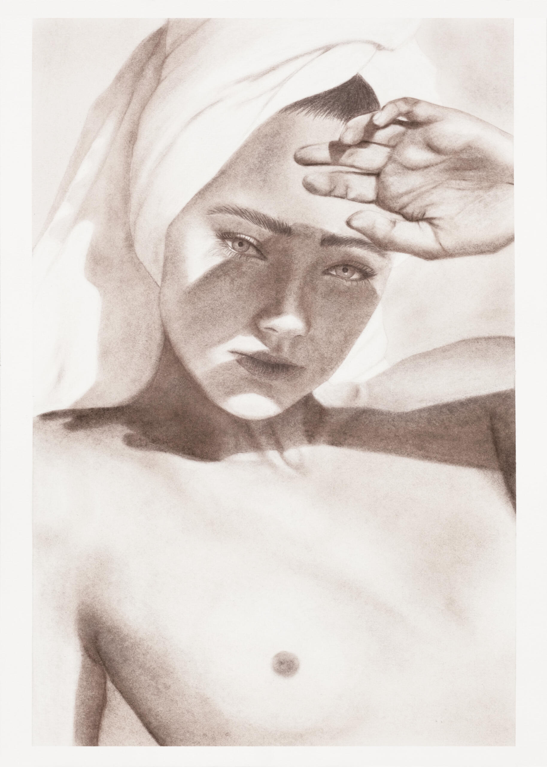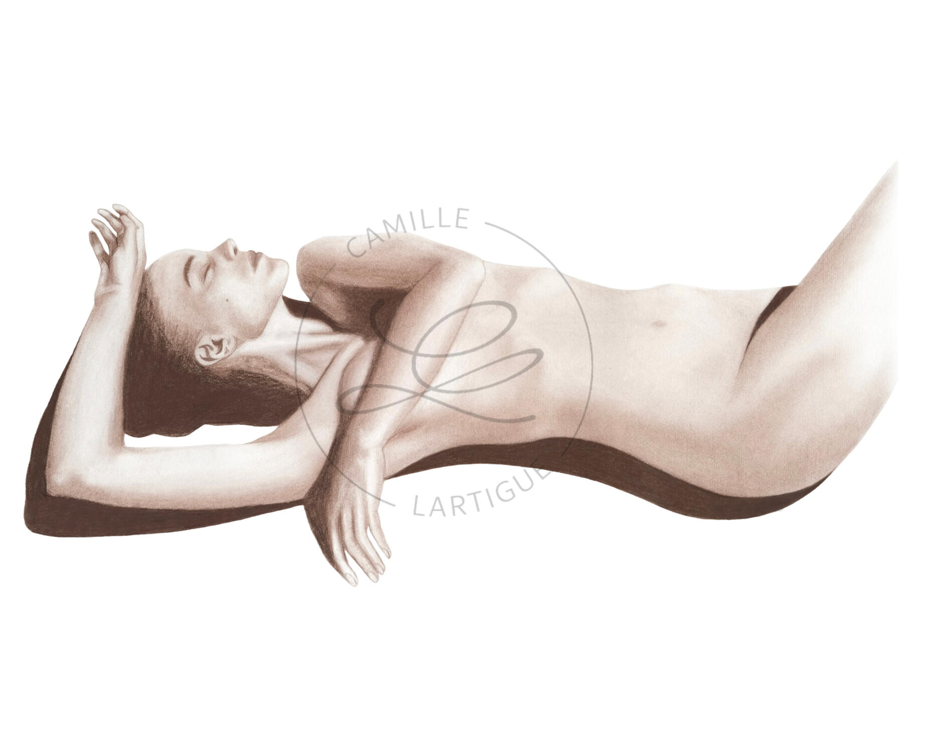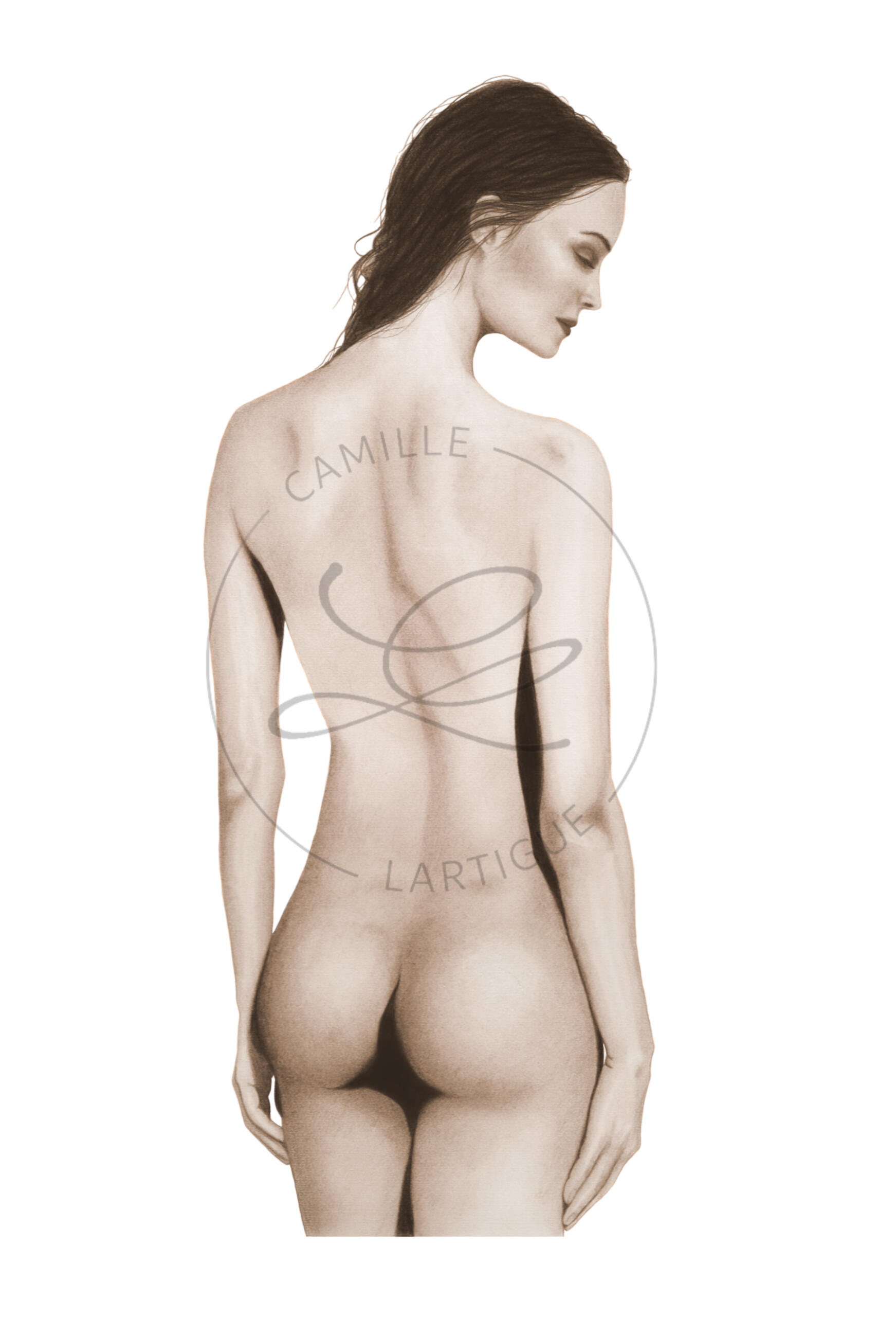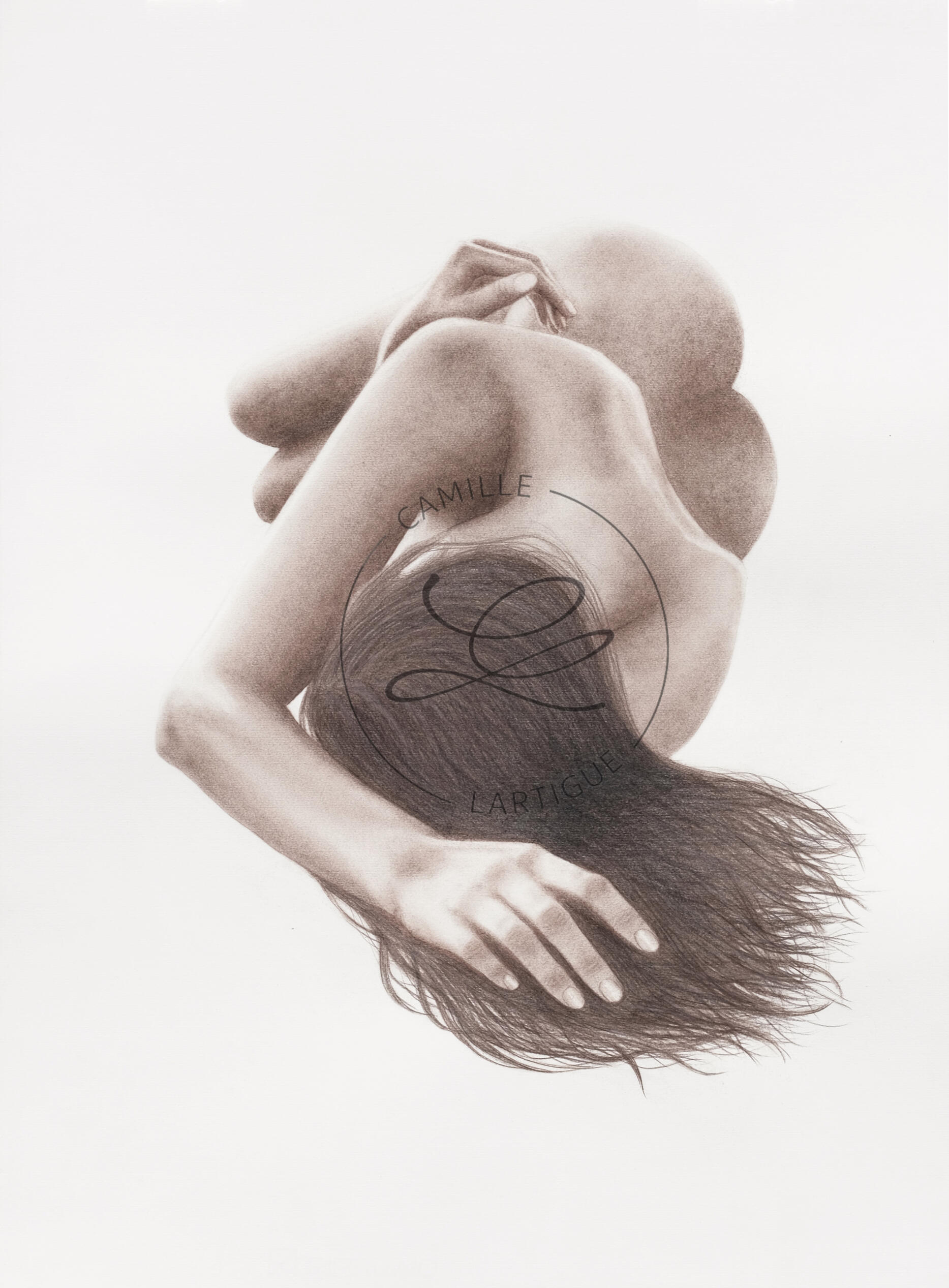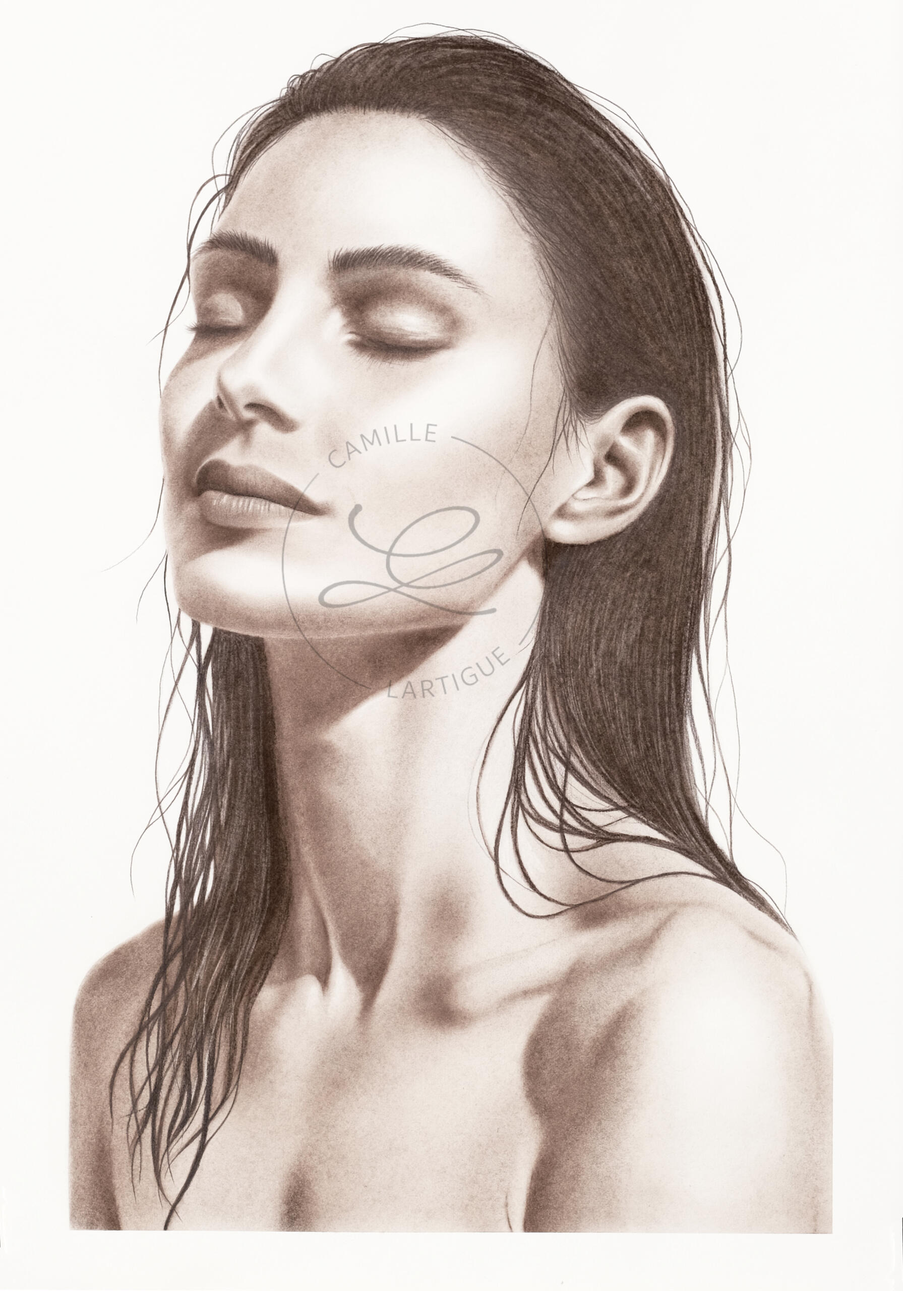 Au lieu du graphite et charbon, tout deux noirs, j’ai toujours choisi le brun ; une teinte chaleureuse qui est devenue ma signature.J'aime décrire ma technique comme une peinture à sec : j'utilise exclusivement des pastels secs et crayons, dont j'applique les pigments avec divers pinceaux.Je travaille sur du papier coton Rosaspina à grain naturel et bords frangés. J’ai été séduite par son grain distinctif qui transparaît sous le pigment et sa teinte légèrement ivoire.Les pièces originales présentent les bords frangés caractéristiques de ce papier, tandis que les tirages numérotés sont réalisés sur papier Hahnemühle Fineart.